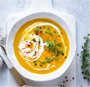 Pumpkin cream soup with pink peppercorn